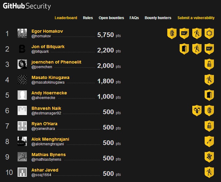 下图是Github上的赏金猎手的排行榜(https://bounty.github.com/index.html#leaderboard)你可以上去挨个看看他们找到的问题,你会发现好些安全问题都很小,有些只能说是不是很规范的问题,Github都赏了几百刀。我查看了一下github的赏金政策,github赏金至少100刀,到5000刀不等。