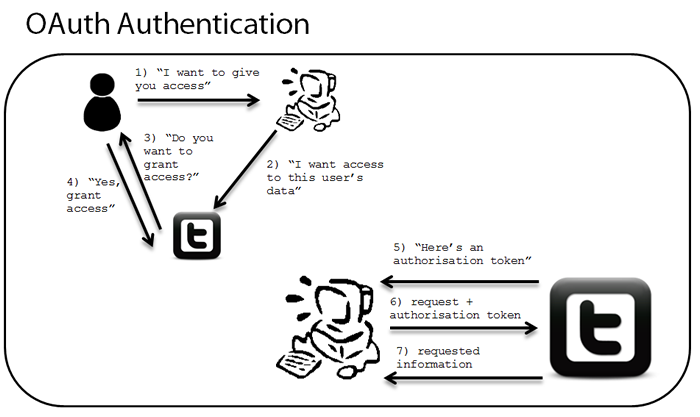 首先,这个故事要从Github OAuth讲起。所以,我们需要先知道什么是OAuth。所谓OAuth就是说,第三方的应用可以通过你的授权而不用知道你的帐号密码能够访问你在某网站的你自己的数据或功能。像Google, Facebook, Twitter等网站都提供了OAuth服务,提供OAuth服务的网站一般都有很多开放的API,第三方应用会调用这些API来开发他们的应用以让用户拥有更多的功能,但是,当用户在使用这些第三方应用的时候,这些第三方的应用会来访问用户的帐户内的功能和数据,所以,当第三应用要干这些事的时候,我们不能让第三方应用弹出一个对话框来问用户要他的帐号密码,不然第三方的应用就把用户的密码给获取了,所以,OAuth协议会跳转到一个页面,让用户授权给这个第三方应用以某些权限,然后,这个权限授权的记录保存在Google/Facebook/Twitter上,并向第三方应用返回一个授权token,于是第三方的应用通过这个token来操作某用户帐号的功能和数据时,就畅通无阻了。下图简单地说明了Twitter的OAuth的授权过程。