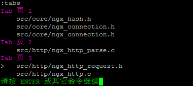 你可以看到Vim打开了四个文件,编号是4,5,6,7,如果你要切换打开的文件,这个时候,你不要按回车(按了也没事,只不过按了就看不到:ls输出的buffer列表了),你可以使用下面的命令切换文件(buffer后面的4表示切到4号文件也就是src/http/ngx_http.c):