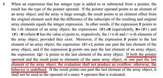 关于这个事,你可以看一下C99的规范说明《 ISO/IEC 9899:1999 C specification 》第 §6.5.6 页,第8点,我截个图如下:(这段话的意思是定义了指针+/-一个整型的行为,如果越界了,则行为是undefined)