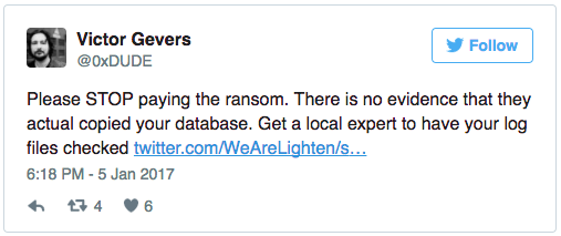 最后,提醒大家一下,被黑了也不要去付赎金,因为目前来说没有任何证据证明黑客们真正保存了你的数据,因为,被黑的服务器太多了,估计有几百T的数据,估计是不会为你保存的。下面也是Victor Gevers的提示: