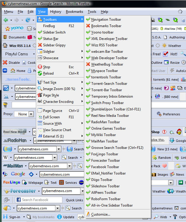 好了,最后两个图片和设计者无关,设计者在开始的时候可能并没有想到UI能变成这样。下面是关于IE7浏览器的,这张图你可能并不陌生,这是一张当我们的IE被安装了各种工具条后(很多是流氓软件)后的样子。(点击大图细细欣赏)