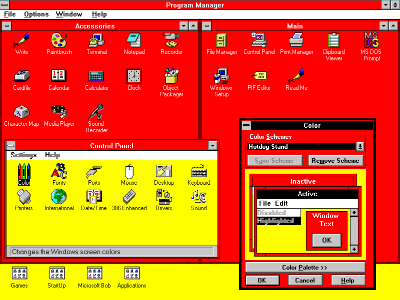 让我们再来看看历史上Windows 3.2的某个配色方案:hotdog(如下图所示),真不知道这是谁配的,真是——“红配黄,喜洋洋”啊。