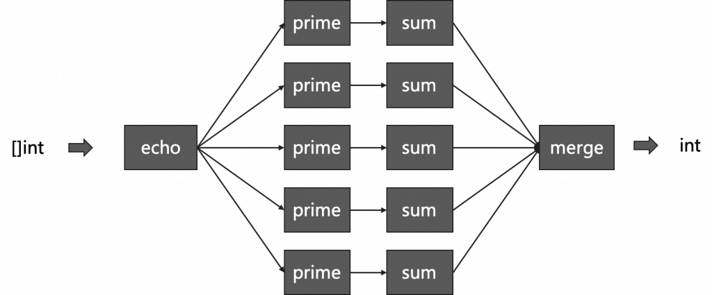 • 此时,生成 5 个 Channel,然后都调用 sum(prime(in)) ,于是每个Sum的Go Routine都会开始计算和