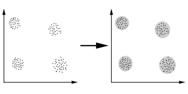 K-Means算法主要解决的问题如下图所示。我们可以看到,在图的左边有一些点,我们用肉眼可以看出来有四个点群,但是我们怎么通过计算机程序找出这几个点群来呢?于是就出现了我们的K-Means算法(Wikipedia链接)