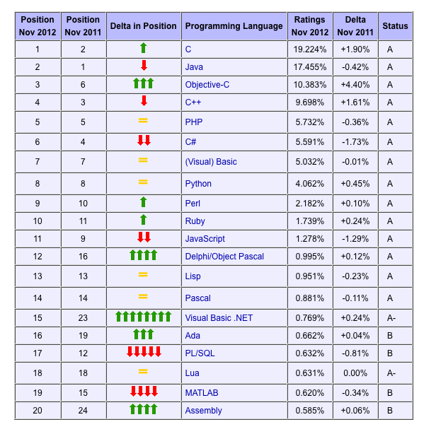 - 每个月tiobe上都会给一个编程语言的排名,来显示各种语言的流行度。排名指数综合了全球范围内使用该语言的工程师人数、教学的课程数和第三方供应商数。截止至2012年11月份,tiobe公布的编程语言排行榜里,bash的指数是0.56%排名22位。如果算上它旗下的awk 0.21%和tcl 0.146%,大概就能排到14名。注意这里还不包括bash的同源的兄弟姐妹csh、ksh等,算上它们,shell家族有望接近前十。值得一提的是一直以来shell的排名就很稳定,不像某些“暴发户”语言,比如objective-c,这些语言的流行完全是因为当前Apple系的崛起,但这种热潮极有可能来得快去得更快。