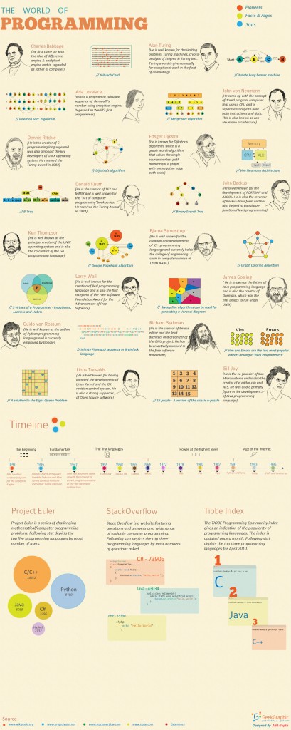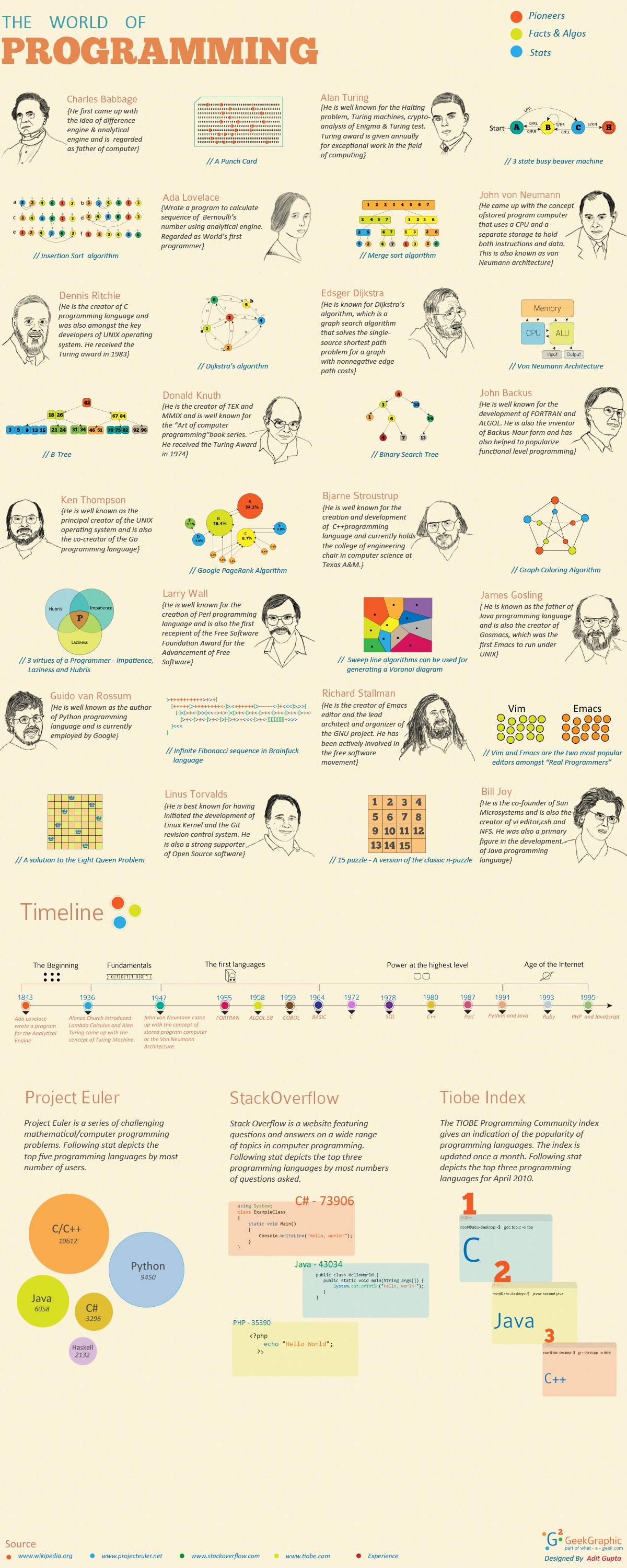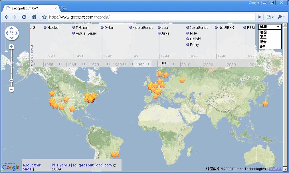 有人使用Google Map做了一个网页,把所有编程语言的时间线和地理位置,如下图,上面是一个编程语言的时间轴,下面是Google Map地图,点击编程语言,你可以查看该编程语言的发明者,发明地,和其Hello World示例(点击这里查看更多的Hello World)