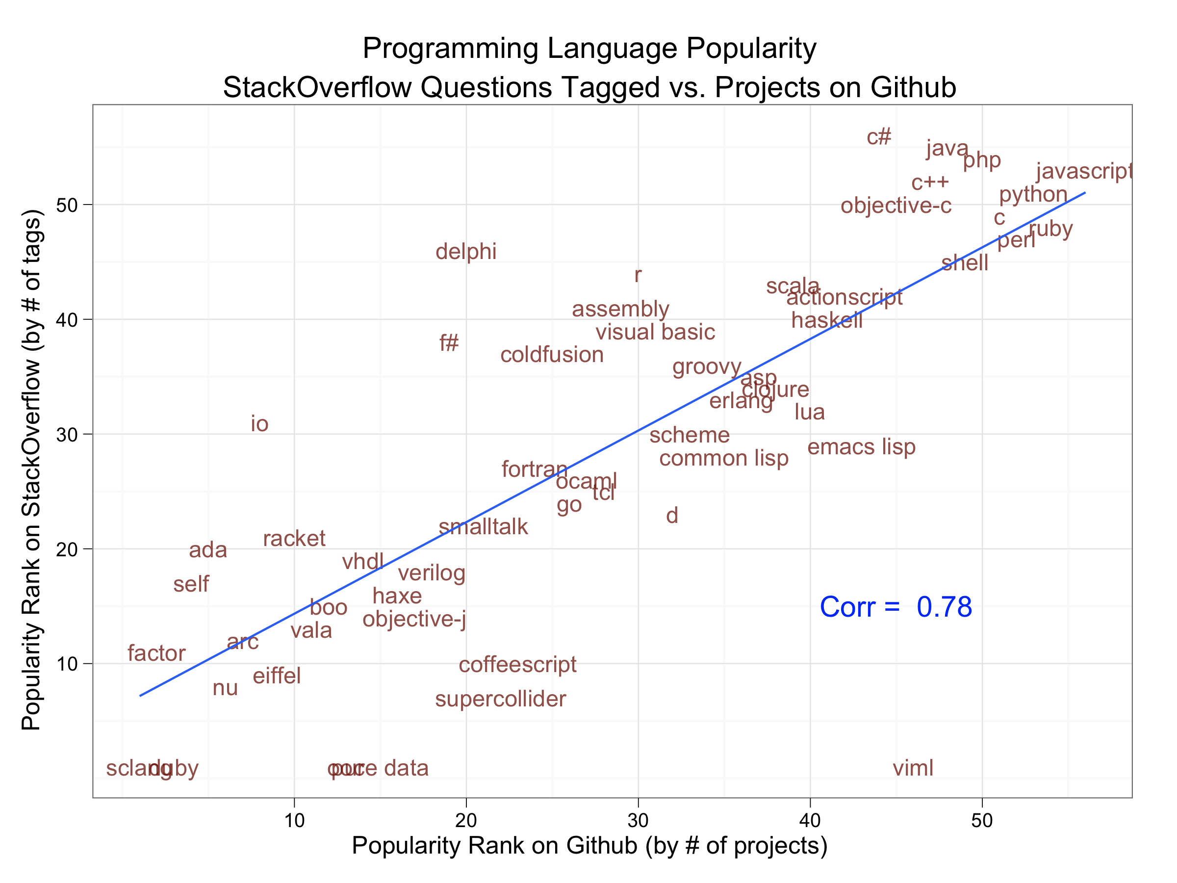 下面是一个关于编程语言流行度的图(以前本站也有一篇编程语言流行度的文章)。其X轴是从Github中取来的数据(项目数),而Y轴是从StackOverflow取来的(tag数)。注意:Github提供了语言流行度:https://github.com/languages,而本图的原始数据在这里。